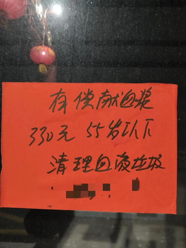 小区门口一张醒目的红底黑字吸引了我的注意,上面赫然写着“有偿献血浆,330元,55岁以下”。这是一张手写的通知,也没有盖章,让人不得不怀疑是个人行为,如果是个人行为会不会涉及到买卖血液?